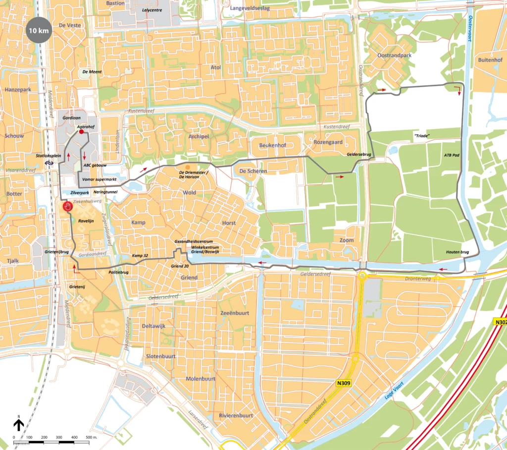 Steek het fietspad over en houd bij de splitsing rechts aan. We lopen langs de achterkant van de Rozengaard richting de Oostranddreef. Bij de Oostranddreef steken we de Gelderse Brug over en slaan direct linksaf. Volg het fietspad tot aan het Oostrandpark en ga daar rechtsaf. Volg het pad, dat met een bocht naar links en vervolgens naar rechts loopt, tot aan de Oostervaart. Ga rechtsaf en volg het pad langs de Oostervaart. Aan het einde steek je links de houten brug over.